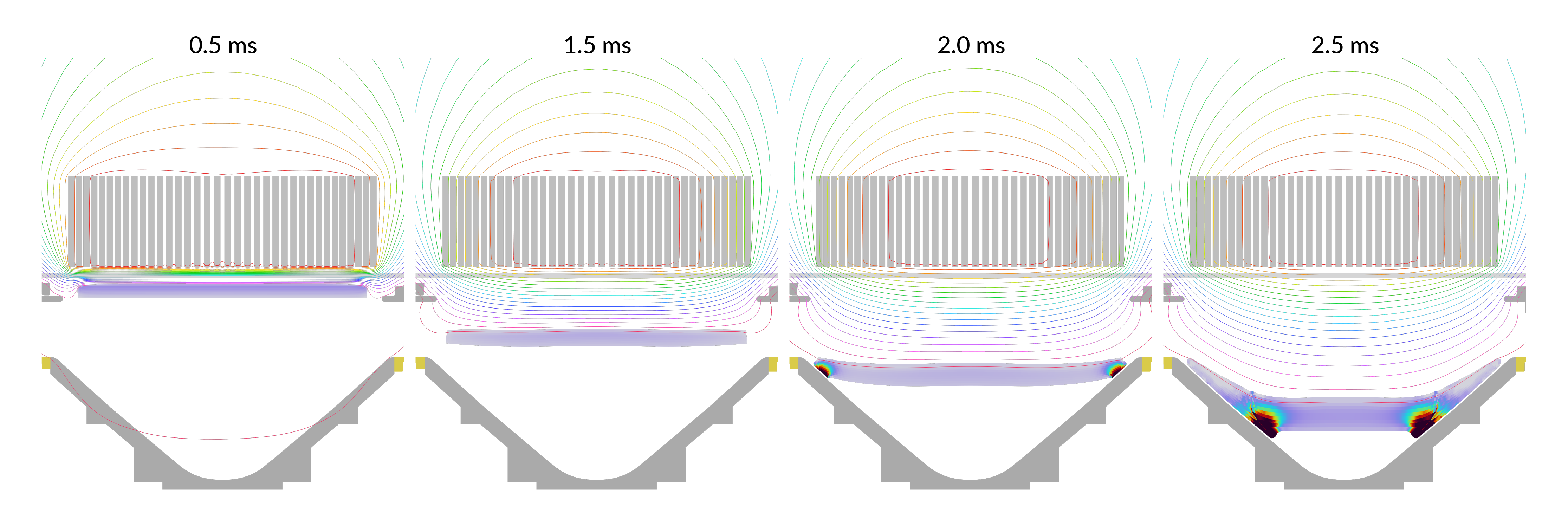 "The full model is quite complex," Teller said. "It utilizes a moving mesh for the lithium and the compressed plasma as well as nonlinear solid mechanics and the Johnson–Cook material model, and EM forces from modeled circuits drive the compression of the lithium. The lithium liner impacts the hourglass device, so capturing the nonlinear contact is crucial to perform accurate predictions." To add to the complexity, heat transfer occurs between all of these model components.
