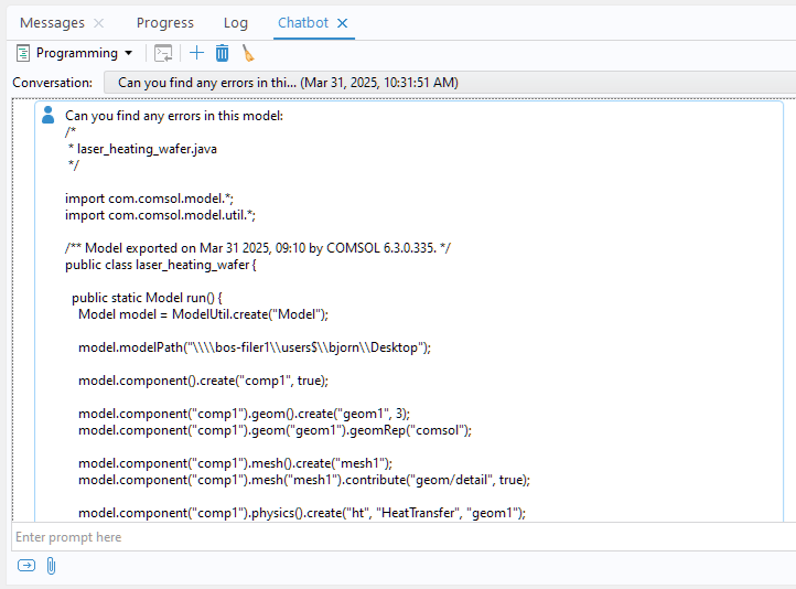 When building multiphysics models and simulation apps, the COMSOL API lets you write code to automate workflows, add custom functionality to your apps, and integrate with external tools. The Chatbot window functionality introduced in COMSOL Multiphysics® version 6.3 connects you directly to OpenAI™ GPT models, allowing you to generate or debug COMSOL API code. For example, it can help convert repetitive tasks into for loops or locate logic errors in a method. You can also use the Chatbot window to query for general modeling advice.