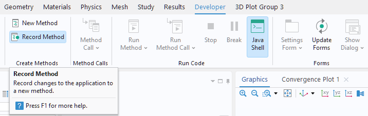 The COMSOL Multiphysics UI showing the Model Builder with the 3D Plot Group selected, the corresponding Settings window, and a pacemaker model in the Graphics window. Next, let’s use the built-in code recording functionality to learn how to add an annotation. On the ribbon, go to the Developer tab and click Record Method to begin recording.